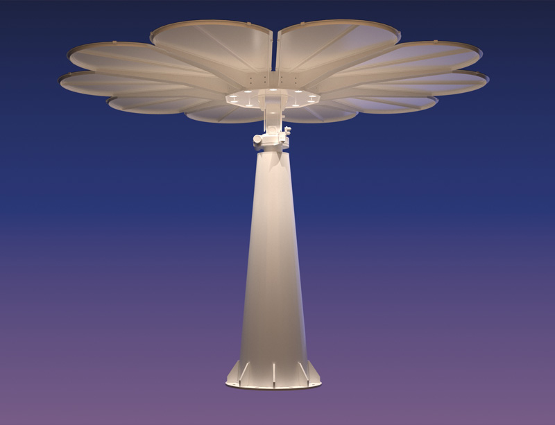 光伏太阳花是一个可移动、可调节的太阳能发电系统。使用全球定位跟踪算法,全天自动追日旋转,可相对提升发电量高达40%。传统光伏电站多以地面及屋顶为主 要安装方式,光伏板+支架的形式 虽然可以达到大面积的安装,但是 却缺少美感,不适合安装在城市环 境中。光伏太阳花将光伏板做成了花朵形 状,造型优美,底座支架采用钢结 构,外涂氟碳漆,光滑防水防腐, 美观性十足,不会破坏环境的整体美感。 且还可安装夜间照明灯具,白天发电,夜间照明, 可代替部分城市路灯,实现低碳改造。